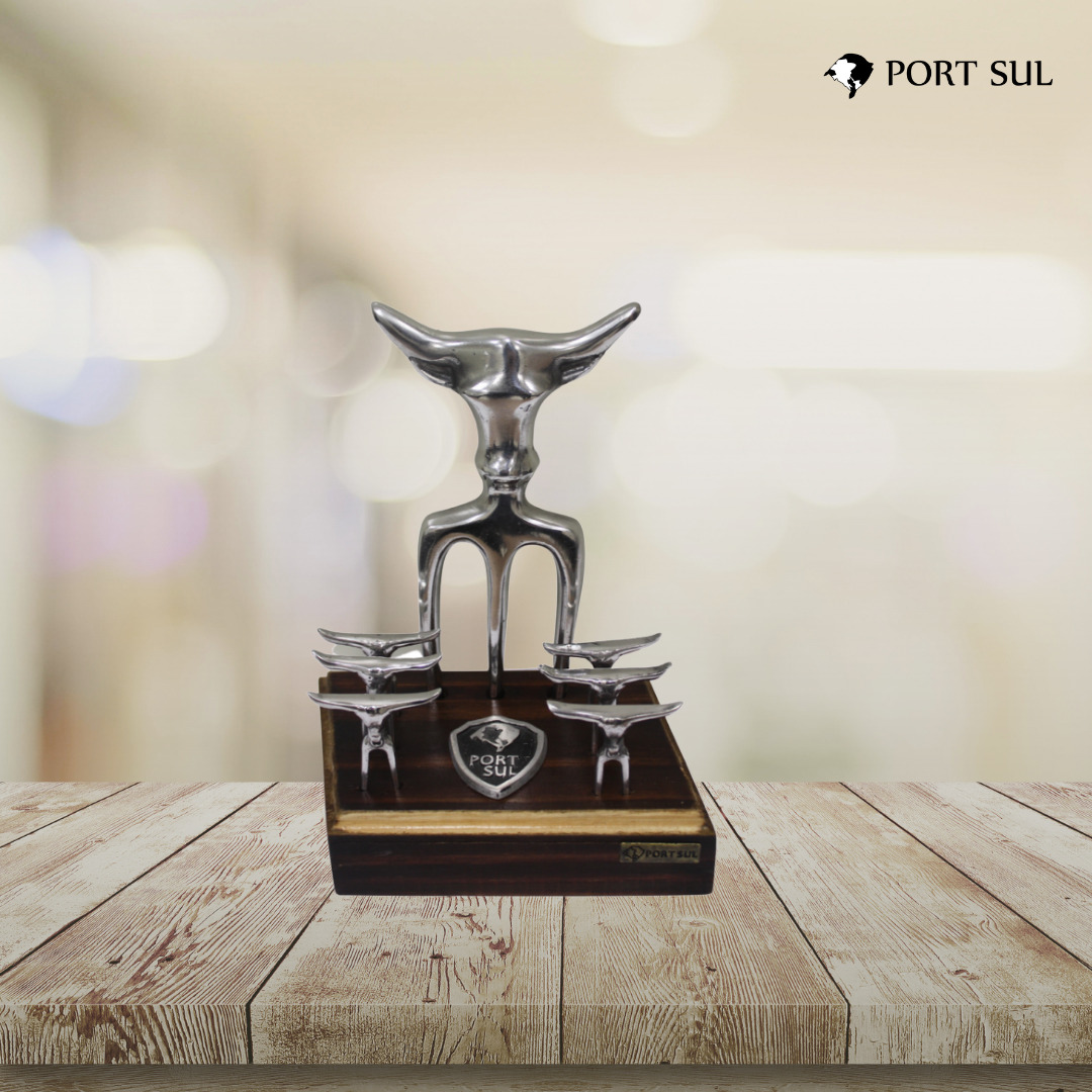 Kit Garfo tridente c/ 6 garfinhos em alumínio com suporte de madeira.